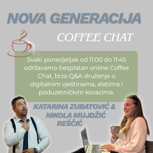 Svaki ponedjeljak od 11:00 do 11:45 održavamo besplatan online Coffee Chat, brzo Q&A druženje o digitalnim vještinama, alatima i poduzetničkim koracima.