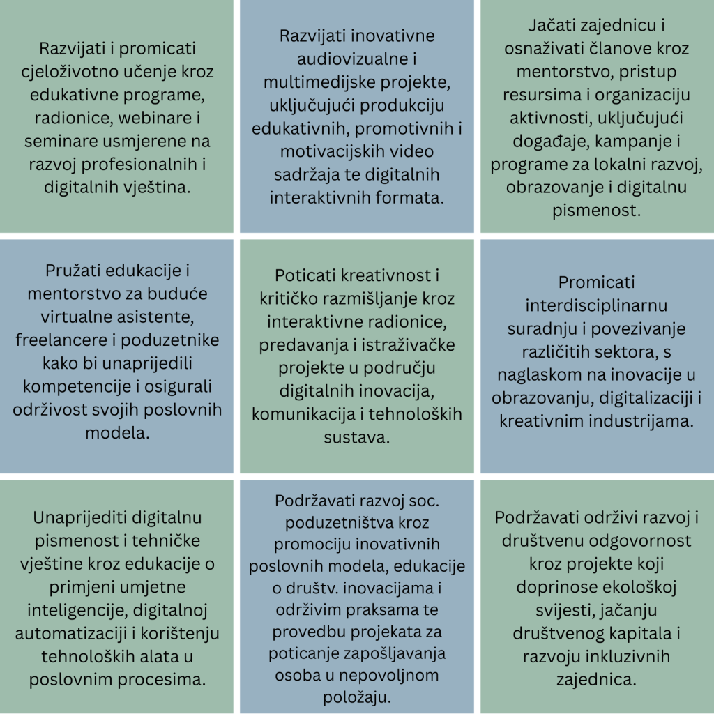 - Razvijati i promicati cjeloživotno učenje kroz edukativne programe, radionice, webinare i seminare usmjerene na razvoj profesionalnih i digitalnih vještina.